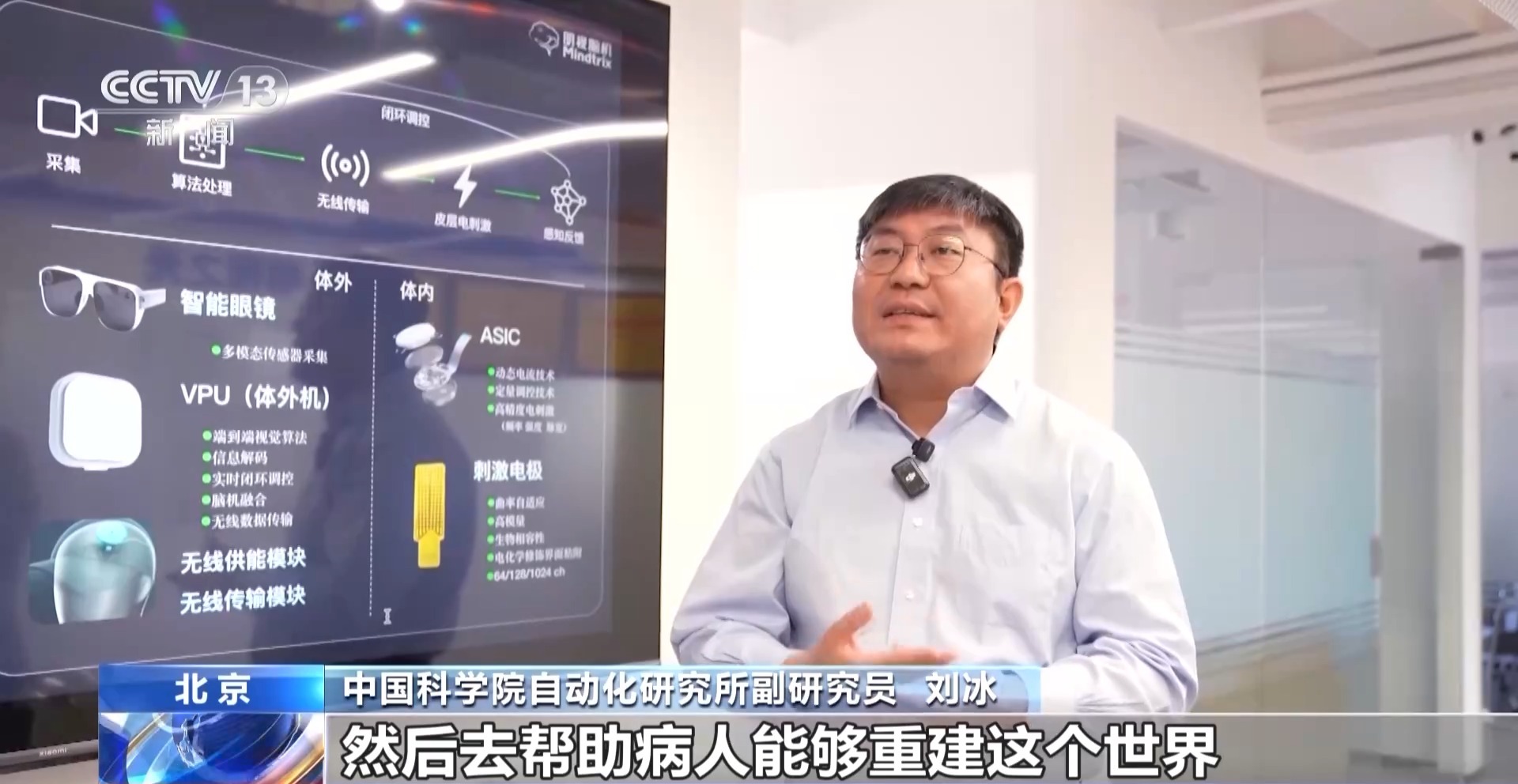 中国科学院自动化研究所副研究员 刘冰:我们是通过植入式脑机接口的方法,去帮助病人能够重建视觉。我们看见这个世界,不光是眼睛看到,实际上是大脑看到的。现在就相当于是在大脑当中直接给予电刺激,模拟大脑看见世界的过程,通过一个外设摄像头,去拍摄外部的景物,然后通过电刺激,让大脑看到外部的摄像头看到的景物。